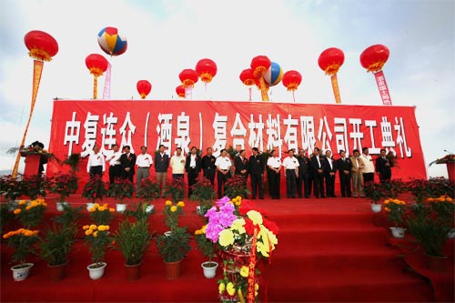 在歡慶的鑼鼓、軍樂(lè)、禮花、鞭炮聲中,參加儀式的嘉賓們?yōu)橹袕?fù)連眾(酒泉)復(fù)合材料有限公司葉片項(xiàng)目開(kāi)工培土奠基。