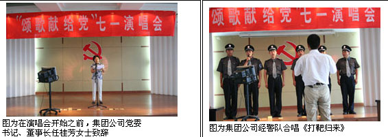 2007年6月30日,為了慶祝中國共產(chǎn)黨建黨86周年,集團公司黨委在五樓多功能廳組織了“頌歌獻給黨 七一演唱會”。集團公司全體黨員、行管人員、班組長以上干部參加了活動。在演唱會即將結(jié)束時,全體參會人員一起高歌《沒有共產(chǎn)黨就沒有新中國》將演唱會推向高潮,全體黨員干部將真抓實干,為完成2007年度公司各項經(jīng)濟指標而努力奮斗,為黨的十七大獻禮。