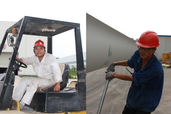在大浦葉片機(jī)加工車間,筆者看到幾名工人正在對葉片進(jìn)行打磨。按照作業(yè)要求,無論室溫多高,他們都必須整齊地穿著工作服,戴著口罩,把自己包裹地嚴(yán)嚴(yán)實實。打磨葉片看似輕松,其實非常消耗體力,同時也需要一顆細(xì)致的心,才能保證葉片完美。張洪波就是這樣的一位打磨工人,工作6年了,每天和同事一起將脫模的葉片打磨光滑,工作仔細(xì)認(rèn)真,保質(zhì)保量,哪里有針眼,就修補(bǔ)然后再打磨。