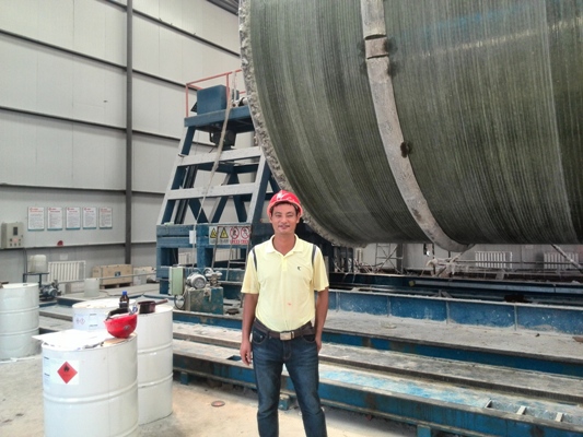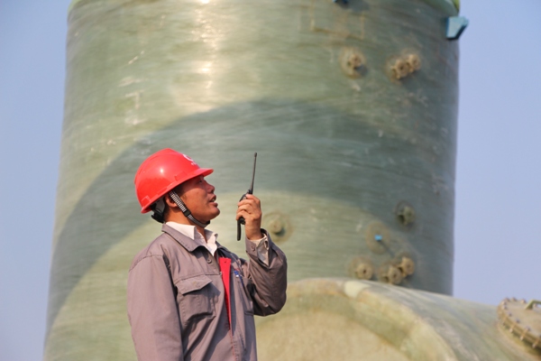 “張斯偉,你們班生產(chǎn)情況如何,有沒(méi)有人員中暑?”“報(bào)告熊經(jīng)理,人員一切正常,保證下班前完成MK-09號(hào)罐體纏繞結(jié)束”纏繞班長(zhǎng)張斯偉用手抹了一把臉上的汗水答道。 “范成雷,現(xiàn)場(chǎng)情況如何,今晚能否完成1號(hào)平臺(tái)的法蘭對(duì)接?”“報(bào)告熊經(jīng)理,人員一切正常,保證今晚保質(zhì)保量的完成任務(wù)”,手糊二班范成磊回答道。像這樣的詢問(wèn)和關(guān)心還有很多很多,不管是在室溫高達(dá)四十二度的纏繞車間還是在六十二米高的玻璃鋼煙囪手糊對(duì)接處,你都能看到虎山項(xiàng)目部經(jīng)理熊國(guó)慶的身影。