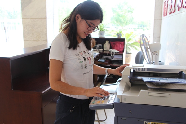 小俞是個(gè)熱心腸的人,同事工作忙,她就幫助他們打印需要的資料,還會(huì)教同事如何使用打印機(jī)和傳真機(jī)。小俞樂(lè)觀開朗的性格也感染到身邊的每一位同事,然他們?cè)谟淇斓臍夥罩袝簳r(shí)忘掉夏天的炎熱。