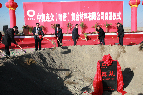 中國(guó)建材集團(tuán)副總經(jīng)理郭朝民、中國(guó)建材報(bào)社社長(zhǎng)陳才來、中國(guó)復(fù)合材料集團(tuán)公司董事長(zhǎng)、總經(jīng)理張定金、哈密地委書記郭連山、哈密地區(qū)政協(xié)工委主任魏天哲、哈密行署副專員牙森·斯地克等出席奠基儀式。中國(guó)復(fù)合材料集團(tuán)公司副總經(jīng)理、連云港中復(fù)連眾集團(tuán)公司董事長(zhǎng)任桂芳主持儀式。