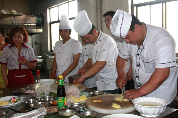 本場比賽每個廚師都要制作兩個菜——必選菜式和自制菜式。必選菜式為家常菜清炒土豆絲,主要考核廚師的刀工、菜品色澤和口味。自制菜式食材總額不超過30元,廚師可自由發(fā)揮,調(diào)味品只可選擇常用調(diào)料,主要考核參賽廚師的廚技和創(chuàng)新能力。